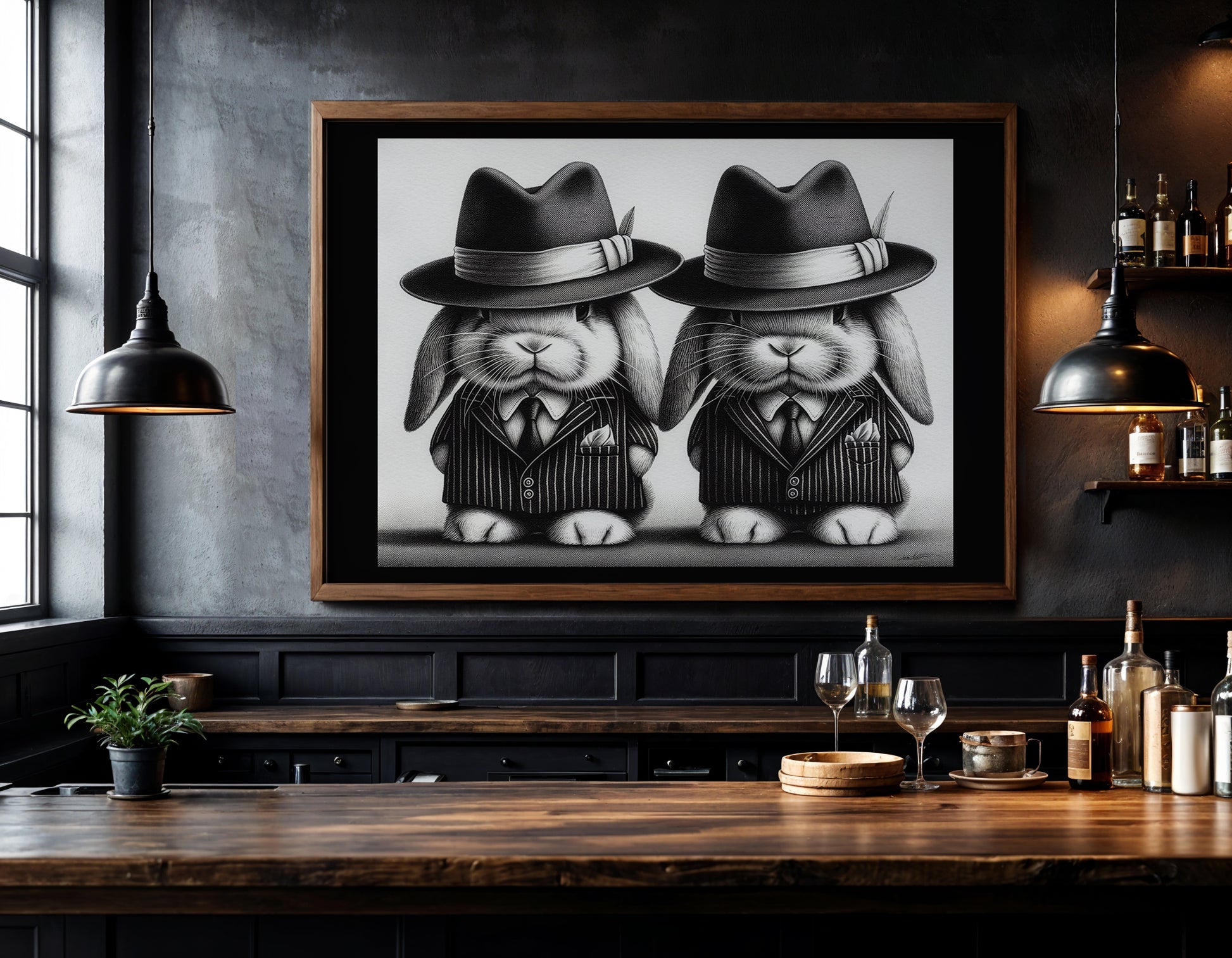 Meet the most dapper duo in town—two irresistibly cute bunnies sporting classic gangster style with fedoras, suspenders, and attitude to match. This hand-drawn digital artwork captures their floppy ears and mischievous charm in playful detail. Perfect for adding a quirky, fun vibe to any space, this design is available across a range of items so you can show off your love for these adorable outlaws wherever you go. Whether you're a fan of vintage style with a humorous twist or just can't resist cute critters with personality, the Gangster Bunnies will bring smiles and conversation starters to your collection.