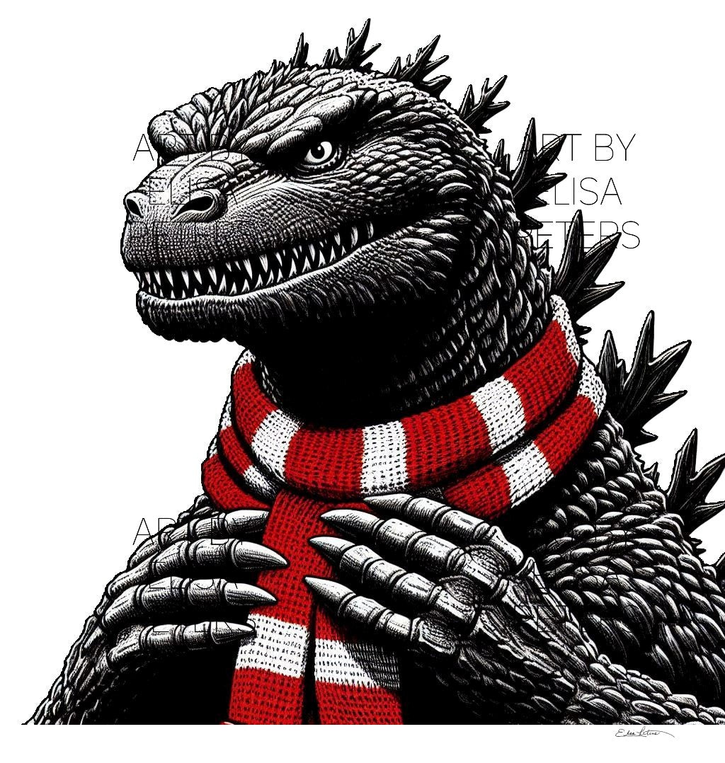 Meet Godzilla in a whole new light—this hand-drawn digital masterpiece captures the legendary monster sporting a charming red and white striped scarf. Perfect for fans who appreciate quirky, artistic takes on pop culture icons, this playful design brings personality to everyday essentials. Available across a range of products, you can carry your love for the King of Monsters wherever you go. A delightfully unexpected twist on a classic character!
