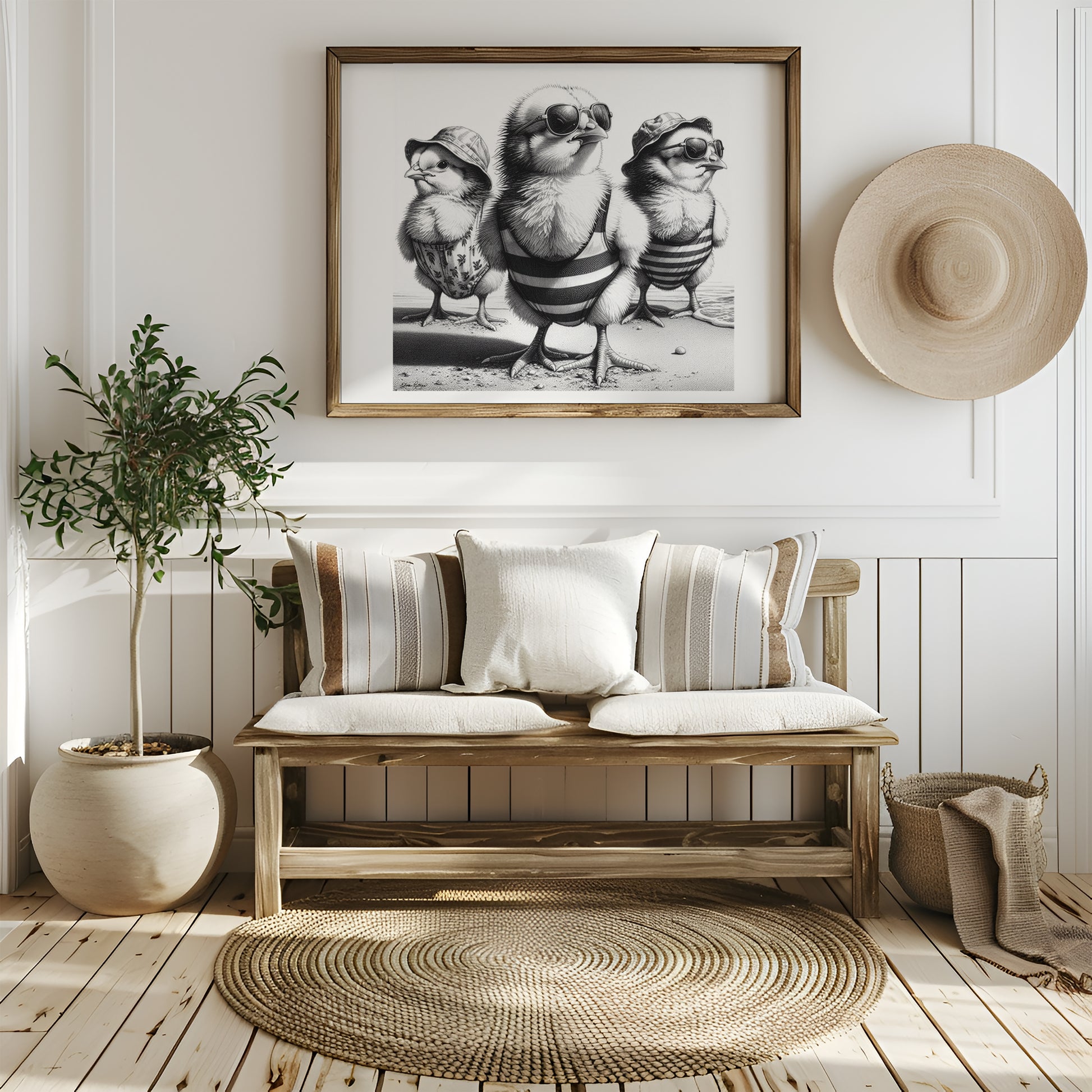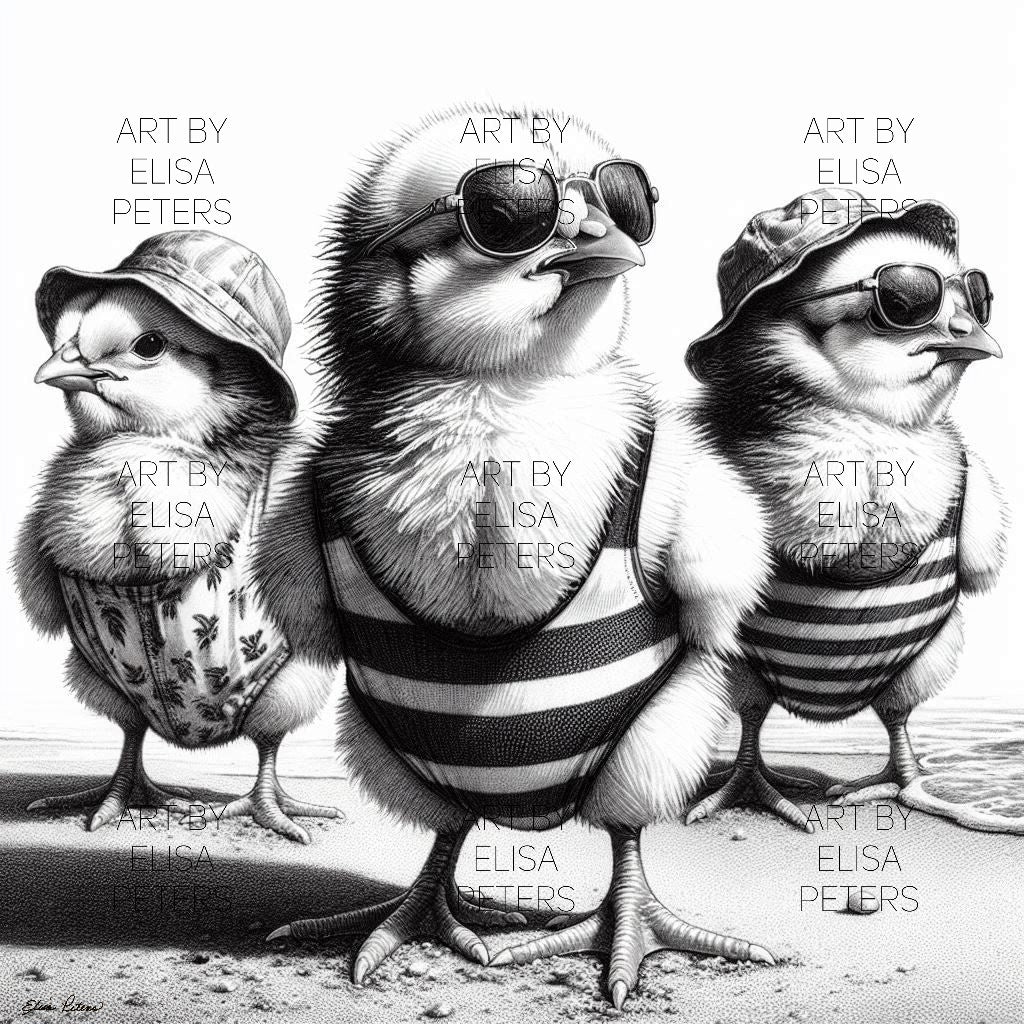 Adorable hand-drawn digital artwork featuring charming chicks living their best beach day! These whimsical characters sport tiny bathing suits and trendy sunglasses, bringing a playful splash of summer fun to any space. Perfect for beach lovers and animal enthusiasts alike, this delightful design is available across a variety of items—from apparel to home décor—so you can share the joy wherever you go. Brighten your day with these sun-loving feathered friends!